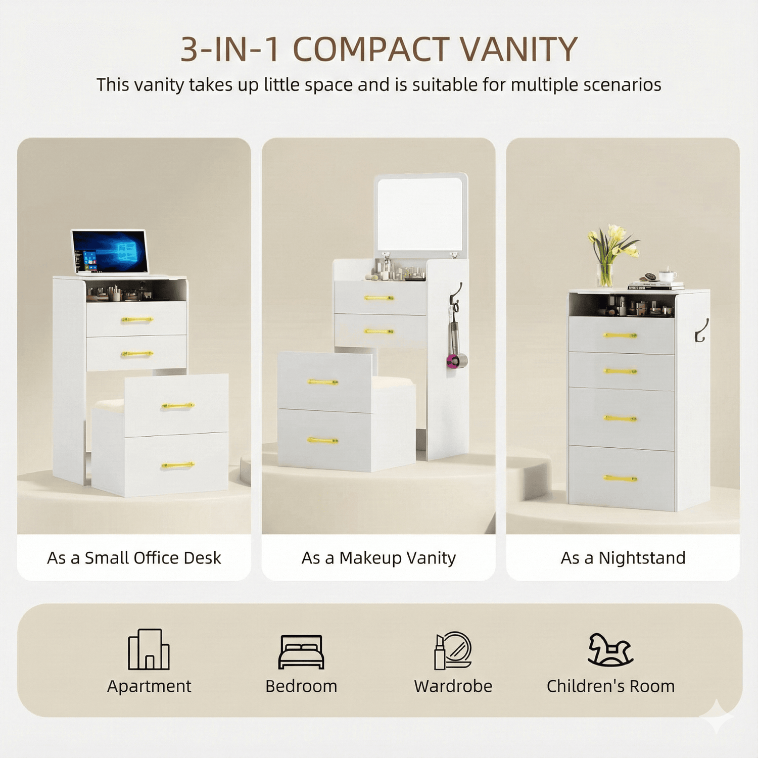 Dieses kompakte 3-in-1 Möbelstück kombiniert Schminktisch, Nachttisch und kleinen Schreibtisch in einem durchdachten Design. Ideal für kleine Räume, in denen Funktionalität und Ordnung gefragt sind.